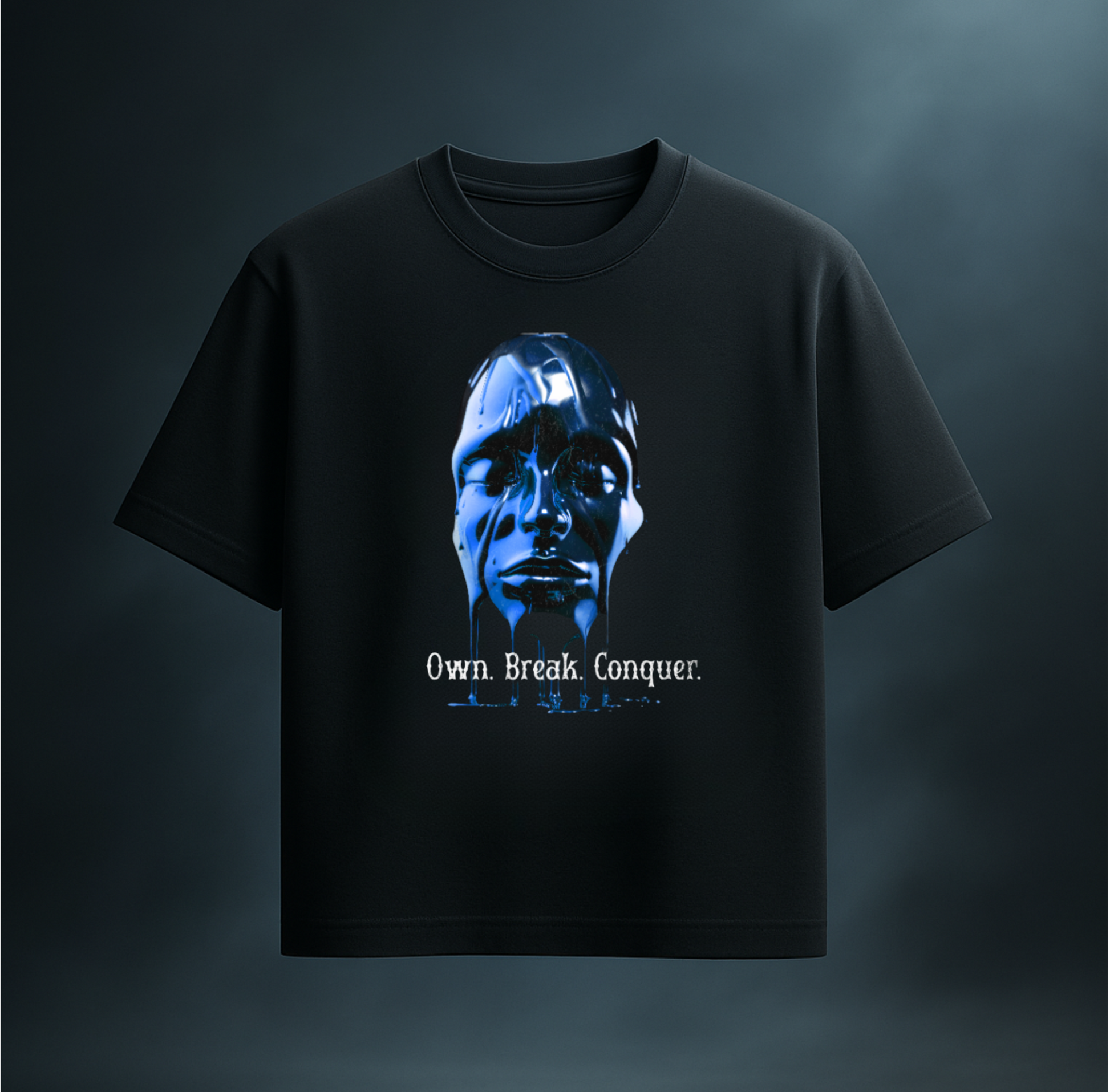 Step into the future with the Own. Break. Conquer. Tee — where art meets dominance. A liquid-metal face emerges from the shadows, symbolizing rebirth through strength and chaos. This piece isn’t just worn — it’s commanded. Designed for the ones who break limits, own their story, and conquer every moment in silence and style.